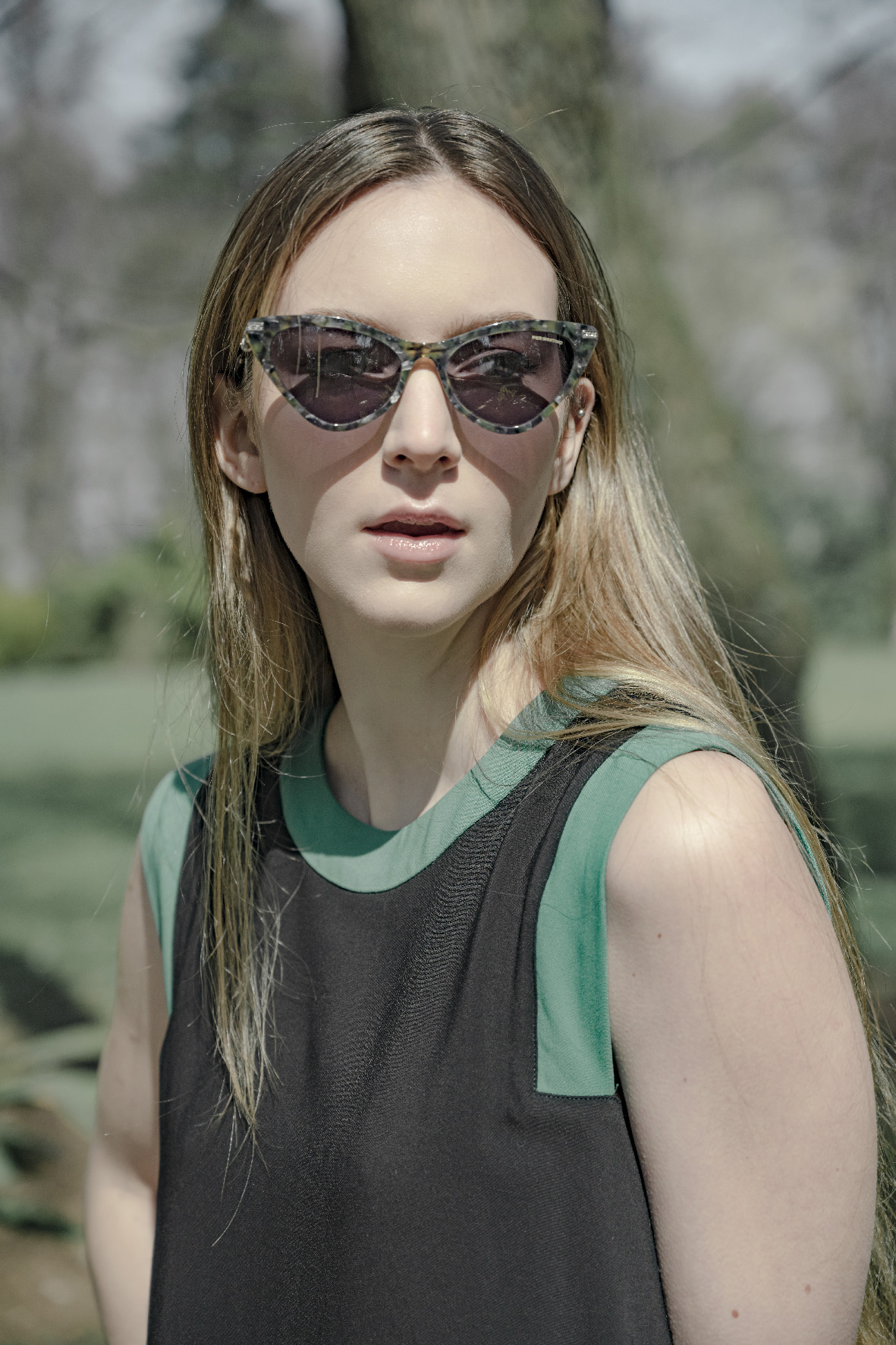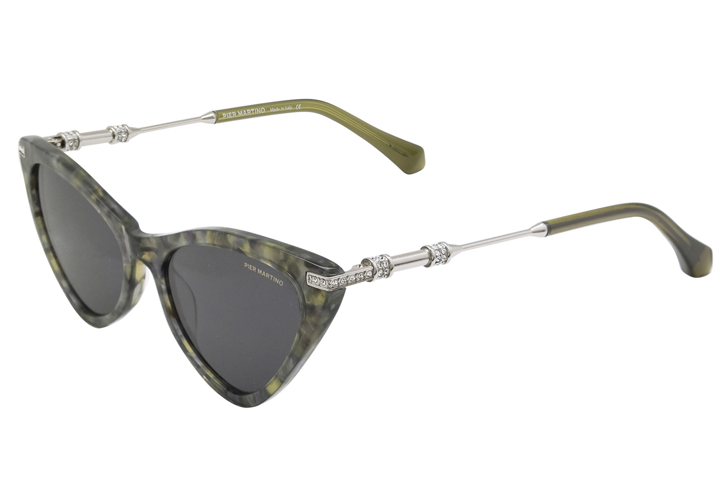 Marbled green acetate sunglasses, silver metal temples with silver crystals fabric inserts. Clear crystals and solid grey lenses.